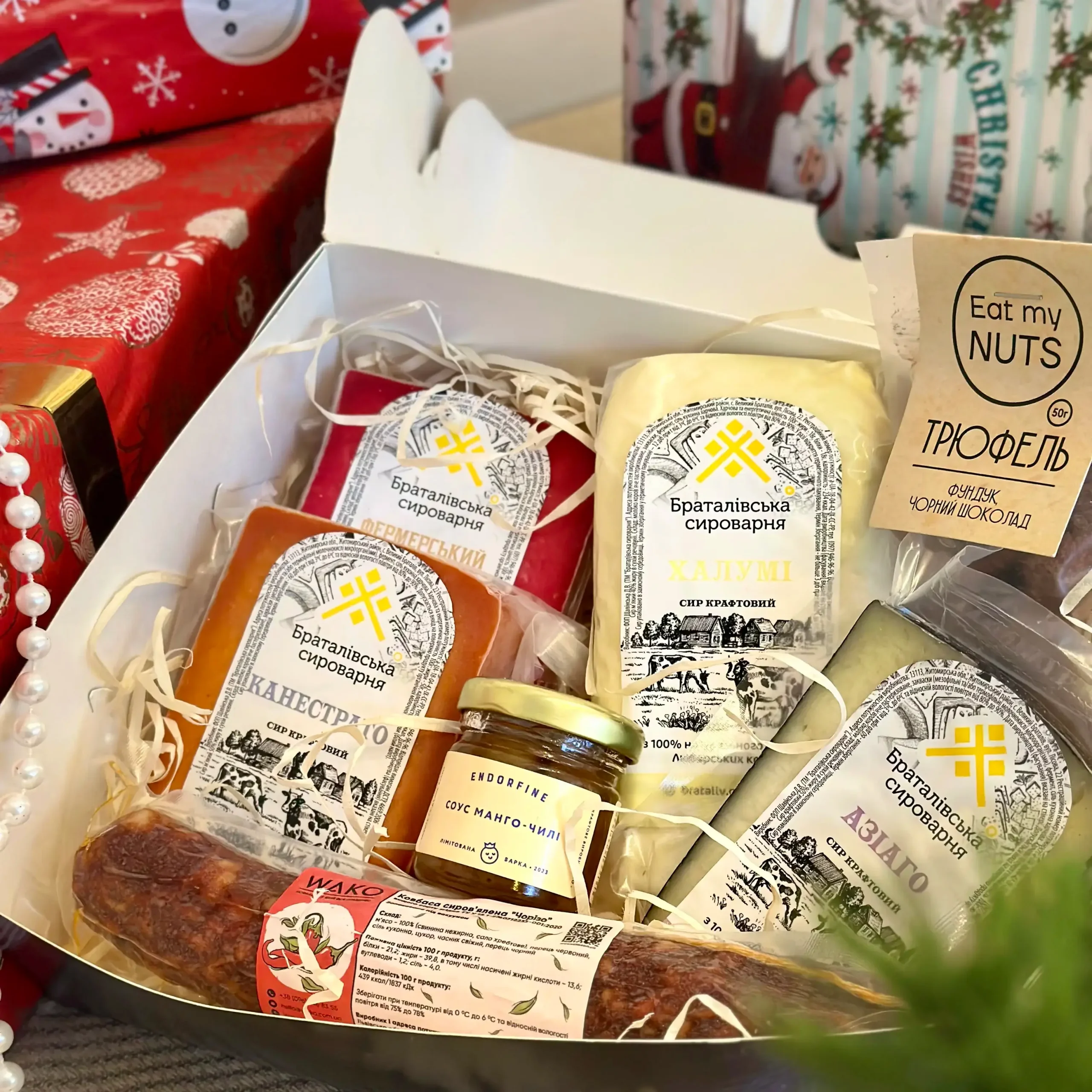 Це святковий бокс, який точно не залишиться без уваги! Усередині — яскраві крафтові сири, створені на Браталівській Сироварні з любов’ю та європейською якістю: