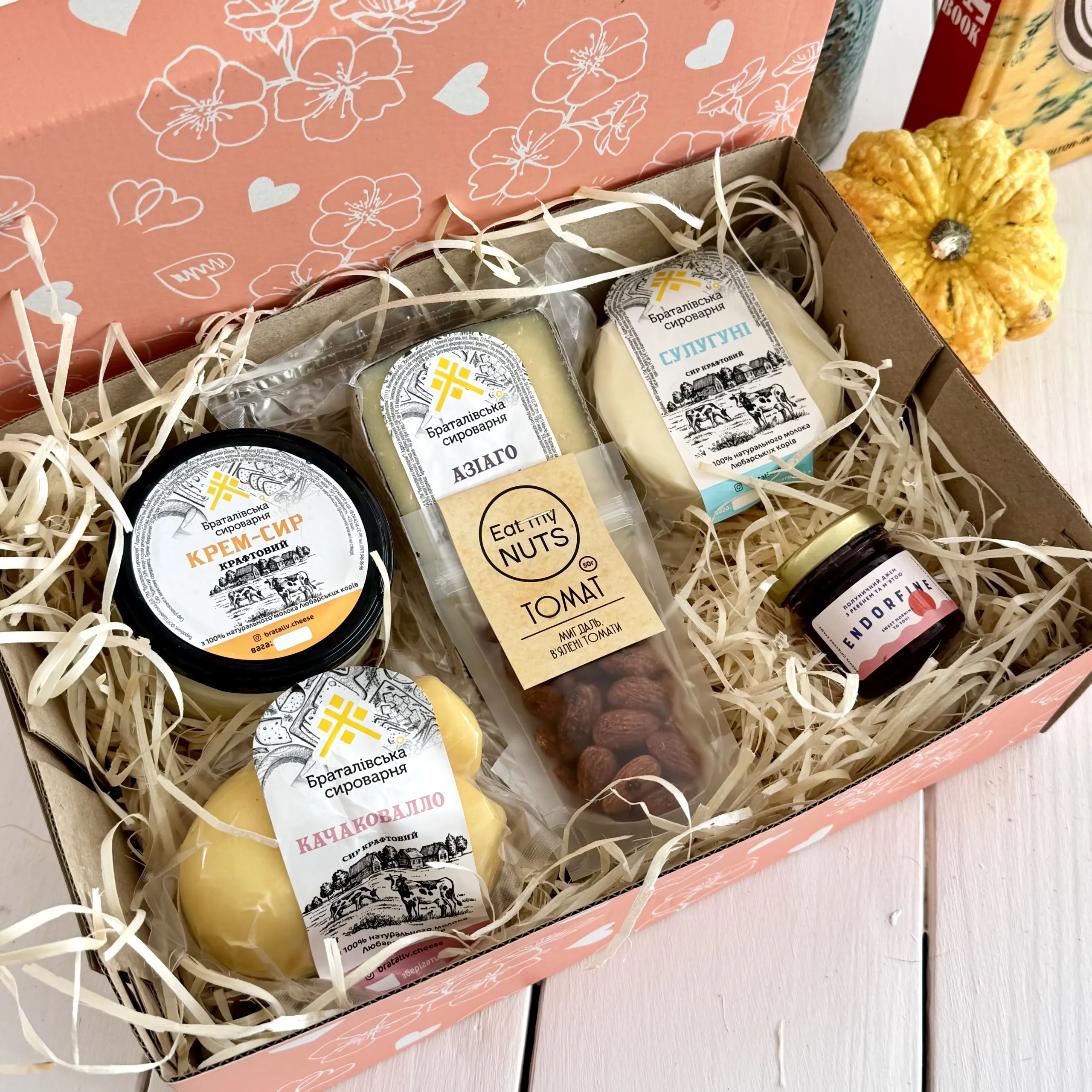 Цей сирний бокс — це зустріч свіжості та витримки. Основа набору — група м’яких та твердих сирів: знаменитий Халумі для смаження, класична Бринза та ніжний Адигейський. Їх чудово відтіняє витриманий твердий Азіаго в розмарині. Це універсальний набір, який підійде і для сніданку, і для гриль-меню, і до вина.